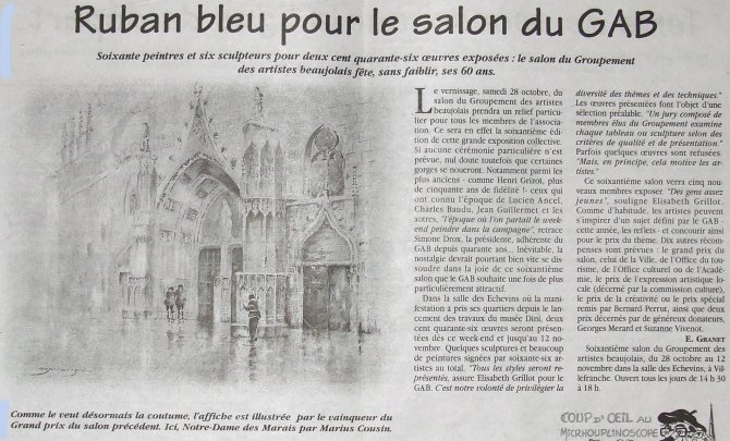 – Marius Cousin s’est vu remettre le grand prix du salon. Une récompense qu’il doit à une aquarelle au dessin raffiné et aux teintes à la fois riches et délicates. Outre ce prix, ce peintre, devenu en peu d’années une valeur sûre du GAB, a vu son tableau Notre-Dame des Marais, acheté par la ville.
